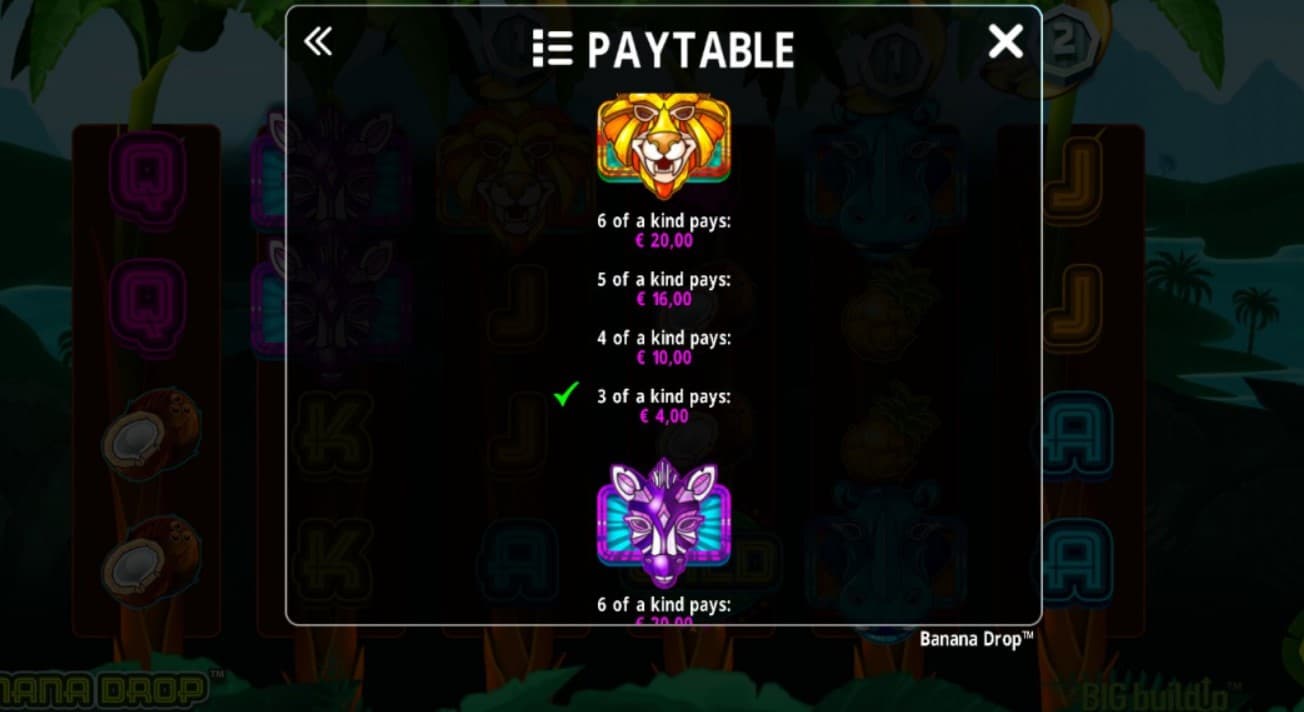During your gaming sessions on the Banana Drop slot, you will also come juicy watermelons, pineapples, and coconuts that deliver payouts up to 0.8x your stake for six of a kind winning combos. You scoop payouts worth up to 1x your stake for landing six matching symbols of mighty lions, zebras, giraffes, and hippos. As expected, there are also powerful, replacing wild symbols in the game which step up to help you scoop more winnings thanks to their replacing powers.