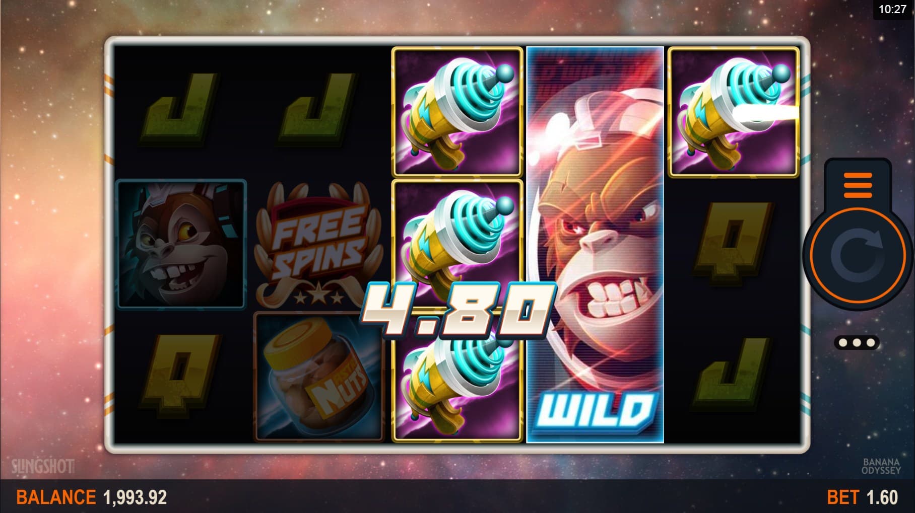 Visually, the game impresses with its reels that appear as they are floating through space. There is also a very funky soundtrack playing in the back which adds more fun. When it comes to the game’s symbols, players will come across lower-valued royals that appear alongside more rewarding Astro nuts, zap guns and of course, the two astronaut chimps.