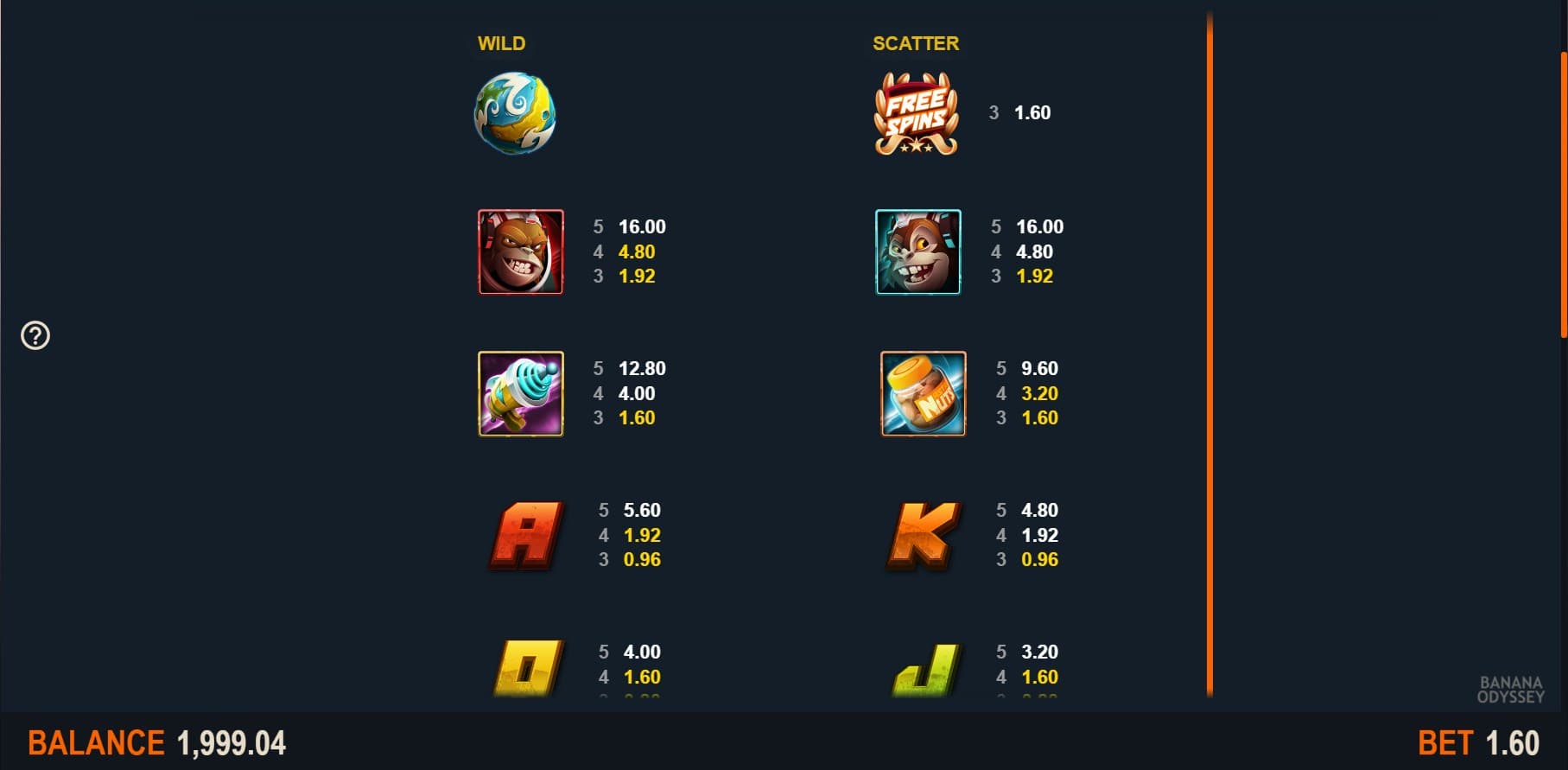 As previously mentioned, with the very first spin on the Banana Odyssey slot, players join astronaut chimps named Chip and Buck on their remarkable journey leading to their Banana planet where the yellow fruit grows everywhere to their delight. Chimps and primates in space are not pure fiction as back in 1948 one primate named Albert traveled to space in a V2 rocket.