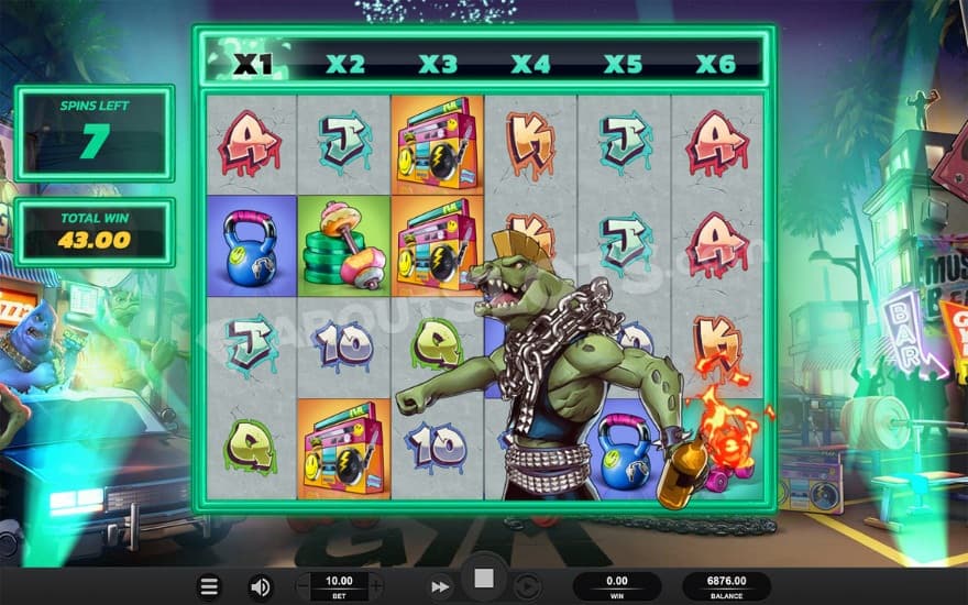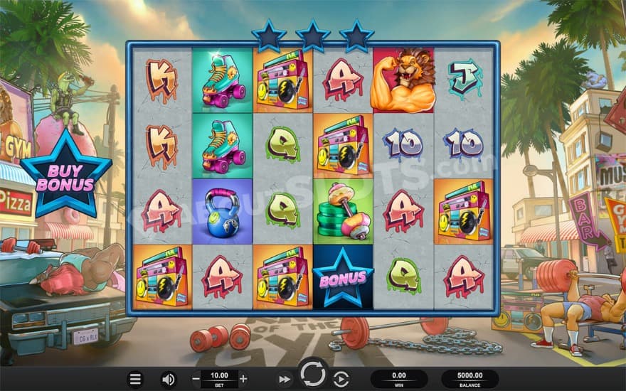 The game's design is based on a Venice Beach theme, where we enjoy an exciting gaming experience together with a couple of exercising beasts. It's a very harmonious theme that we get to enjoy within this slot, where you can see tall palm trees and the gang lifting weights in the background. You can play this slot on all the devices mobiles, notepads and desktops. You create a winning combination by landing 3 or more of the same symbol type on adjacent reels starting at the far left. When a win is created, the Cascade feature is activated, where all symbols that were part of the winning combination disappear and then new symbols fall down to cover the empty positions. This continues as long as new wins are created.