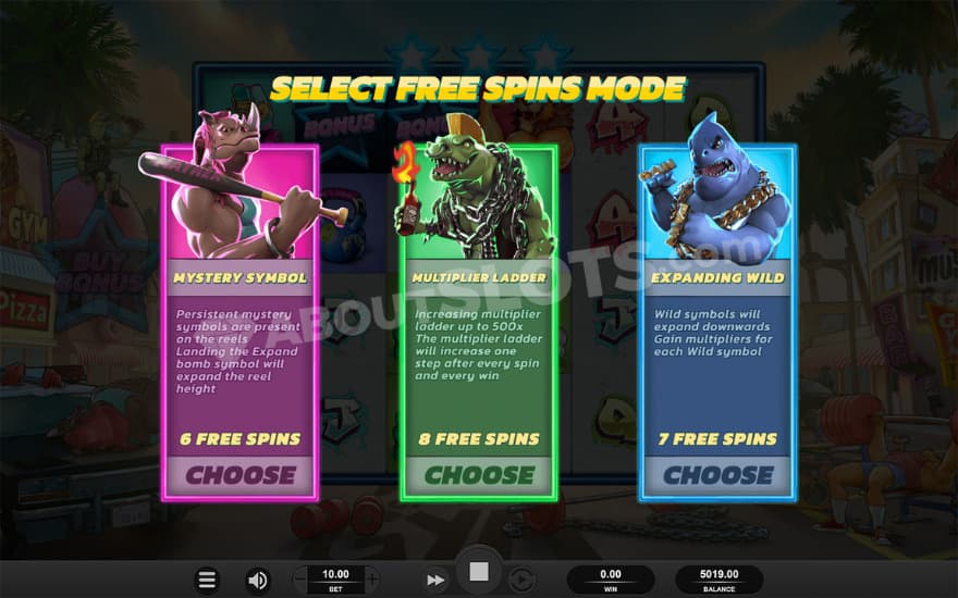 If there's one era that many people miss and many people wish they could have lived through, it's the 80s. If you want to add something to that powerful feeling, the 80s in Venice Beach is said to be the creme de la creme. Within this slot we get a heavy dose of the vibes from that time, where most things are the same with tall palm trees, nostalgic boombox, rollerblades but the streets are ruled by a lion who truly loves his heavy weights. It's a slot that kicks off already within the base game where you get to enjoy spins on a 6X4 reel setup. The wild symbols, as usual, help generate more winning combinations and at times a random mystery spin feature can be activated, where mystery symbols are placed out and by creating wins you receive respins. The music is uplifting and together with the theme itself, it really gives off good vibes. But the vibes immediately get even better once you manage to activate the free spins feature. If you land 3 scatter symbols on activation, you get the opportunity to gamble for 1 extra scatter symbol, which unlocks the upgraded bonus game that gives extra perks.