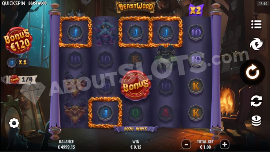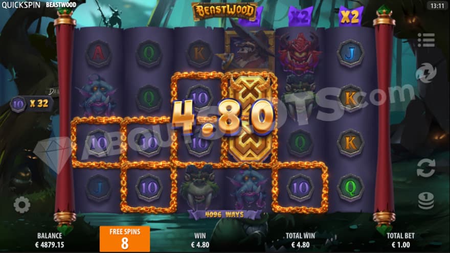 Beastwood is a video slot from Quickspin that has 3 reels and 4 rows from the start, but every time a win is generated, 1 extra reel will be added. Like the Infinity Reels mechanic, this Endless Reels mechanic can thus theoretically obtain infinitely many reels and thus infinitely many ways to win. You can choose between making a Min.bet of 0.20 and a Max.bet of 100. The game has been created with three different RTPs, with an RTP of 96.11% by default, but game operators can also choose to use one of the lower RTPs of either 94.19% or 87.15%. Beastwood has a high volatility, where you can win up to 29541X the bet. If playing with either the RTP of 94.19% or 87.15%, the potential maximum win is either 29520X or 24618X respectively.