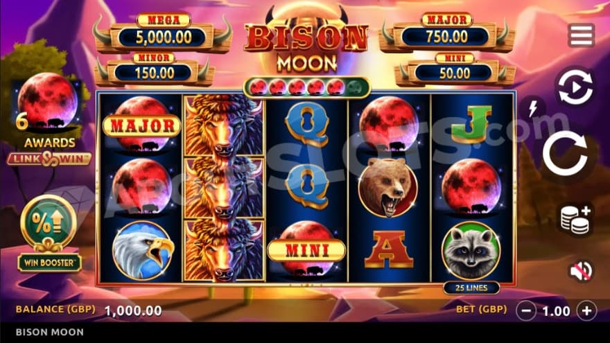Bison Moon is a new video slot from Northern Lights Gaming that features 5 reels, 3 rows, and 25 paylines. Players can choose between a Min.bet of 0.10 and a Max.bet of 20. The game has a default RTP of 96.08%, which is increased to 96.33% if you choose to activate the Boost Feature. Bison Moon is played at high volatility, which can result in a max win of 12.500x the bet!