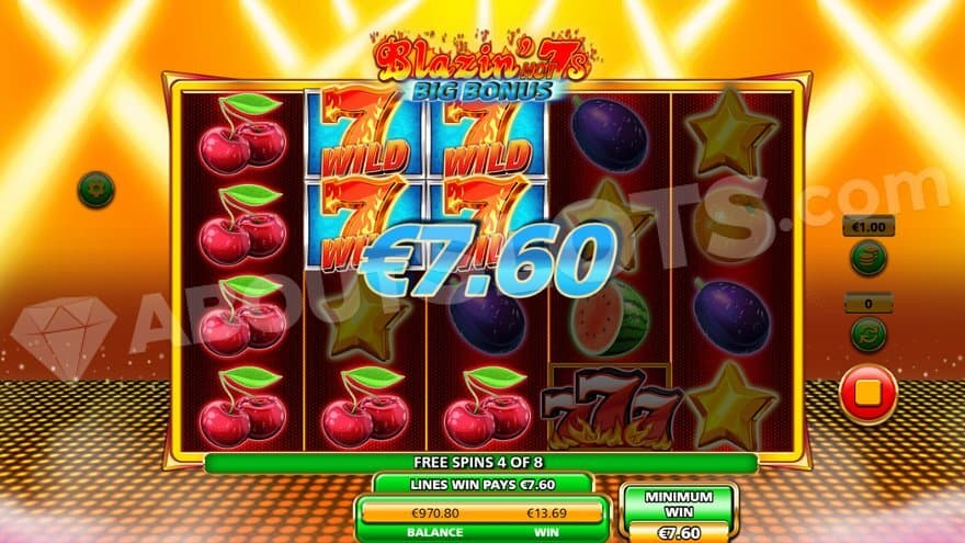 The most wanted feature in many slot machines is the free spins, which is also the case for Blazin’ Hot 7s. When you have landed 3, 4, or 5 Bonus Symbols, the game rewards you with either 8, 10, or 12 free spins. You are guaranteed to win at least 1X on every spin, and as soon as you make a win bigger than that, you’re guaranteed to win at least that amount on the remaining spins. On top of that is the Wild 7 an extra valuable friend here, sticking on to the position it lands on for the rest of the spins. It is not possible to win more free spins within the feature.