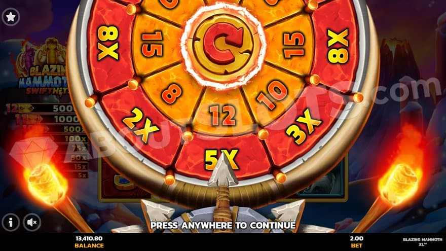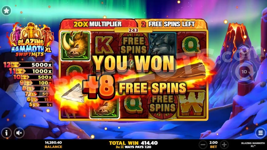 Landing 3 Scatter Symbols on reels 2, 3, and 4 triggers the Free Spins. A Free Spins Wheel grants you 8, 10, 12, or 15 spins and a win multiplier of 2X, 3X, 5X, or 8X. Whenever a Wild Symbol contributes to a win, it reveals a multiplier up to 100X that is added to the overall multiplier. Wins made by Mammoths aren’t multiplied.