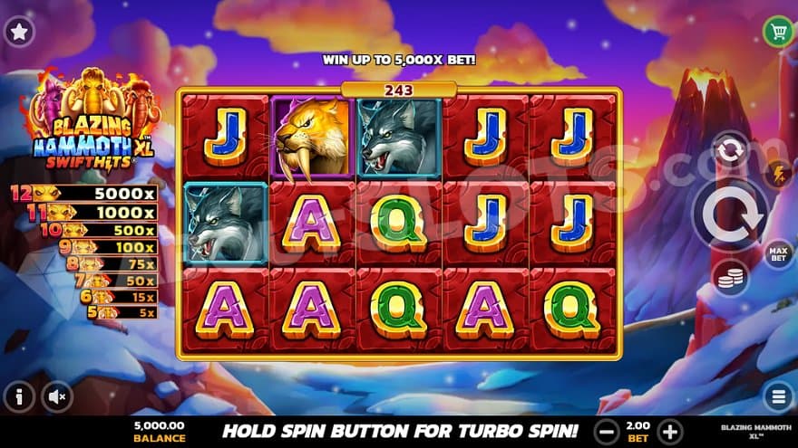 Blazing Mammoth XL invites the player to a freezing world of snow and harsh conditions. The wild animals in this game are not to be played with; neither are the harsh surroundings of this world. We are looking at brown rocky mountains, partially covered by snow. In the distance, on the right-hand side, is a volcano with glowing lava. The reels sit in the middle, and a counter on top tells you there are 243 ways to win from the start. You make wins by landing at least three of the same type of symbols on adjacent reels, starting with the first reel to the left. Blazing Mammoth XL is available on mobile phones and other digital devices.