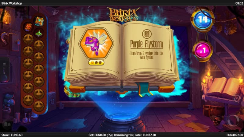 Purple Flystorm = With this spell, either 2, 3 or 4 insects will fly and land on the reels, then convert them all into the same symbol.