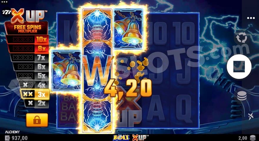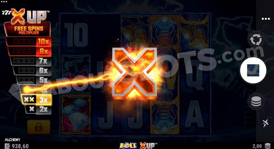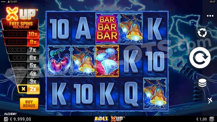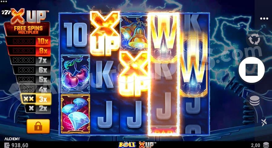 Bolt X UP from Alchemy Gaming is an electric sparking adventure where the player can increase the value of a free spins multiplier in the base game before the feature starts.