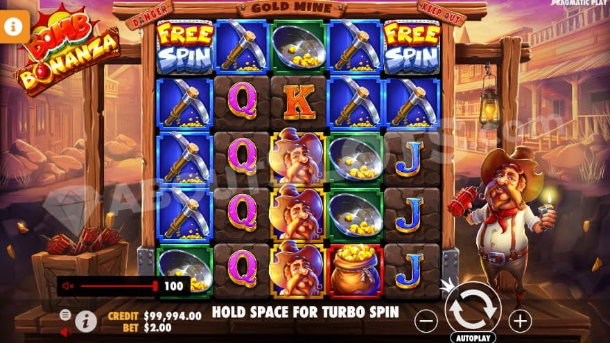 The lower paying symbols are J, Q, K and A. Landing 5 of the same symbol type pays between 2X to 3X the bet. The higher paying symbols are a pickaxe, a pile of small gold nuggets, a sack filled with gold and the miner himself. If you land 5 of the same symbol type, it pays between 6X to 12X the bet. The game's wild symbol is a bomb, while the scatter symbol shows the text Free Spin. During the bonus game, you'll also be able to collect golden nugget symbols, which can bring really festive perks for the lucky player. Let's find out what the features do.