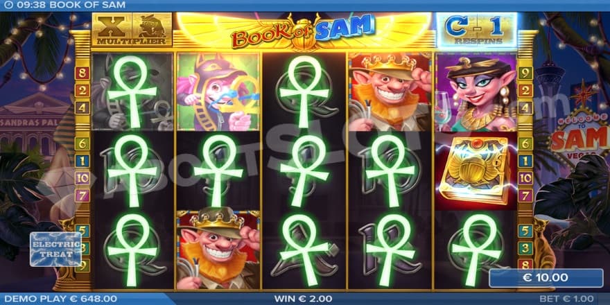 Sam = A win with Sam awards re-spins, and a Book symbol on a random position is awarded. The amount of Sam symbols included in the connection will determine how many spins you receive.