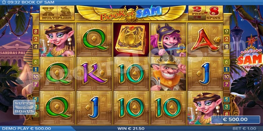 Landing 3 or more Scatter symbols triggers the bonus game with 8 Free Spins, and an expanding symbol is selected. When you land the selected symbol, it will expand and cover its entire respective reel. This creates a large number of winning combinations since these symbols do not have to be on adjacent reels to pay. If your selected symbol is a 10, J, Q, K, or A, it needs to appear on 3 or more reels to trigger the feature. If it’s Sphinx, Maggie, Sandra, or Sam, 2 are enough. Landing 3 or more Book Symbols will award 4 extra spins and an additional expanding symbol, up to a maximum of 5.