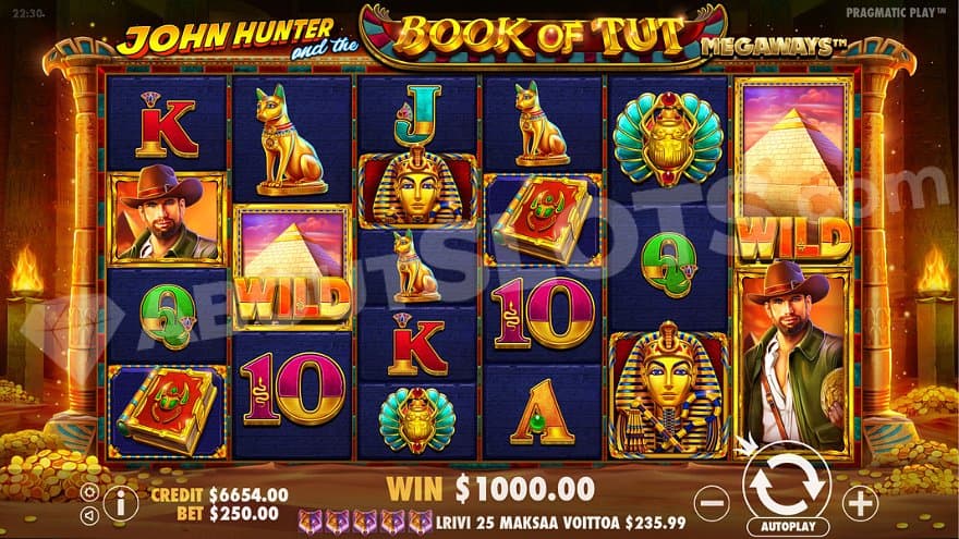 John Hunter and the Book of Tut Megaways is a new casino slot from Pragmatic Play starring the game developer’s Indiana Jones-looking adventurer John Hunter. This guy has been around for a while now, and we know him from adventures searching for Bermuda Riches and the treasures of Da Vinci, to mention a few. In fact, we have already searched for the Book of Tut in other versions before the game now returns in a Megaways version. You can count on expanding symbols turning up randomly in the base game and a specifically chosen symbol that will expand every time it appears in the Free Spins.