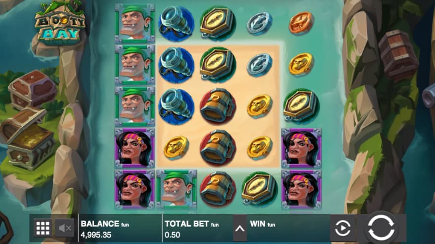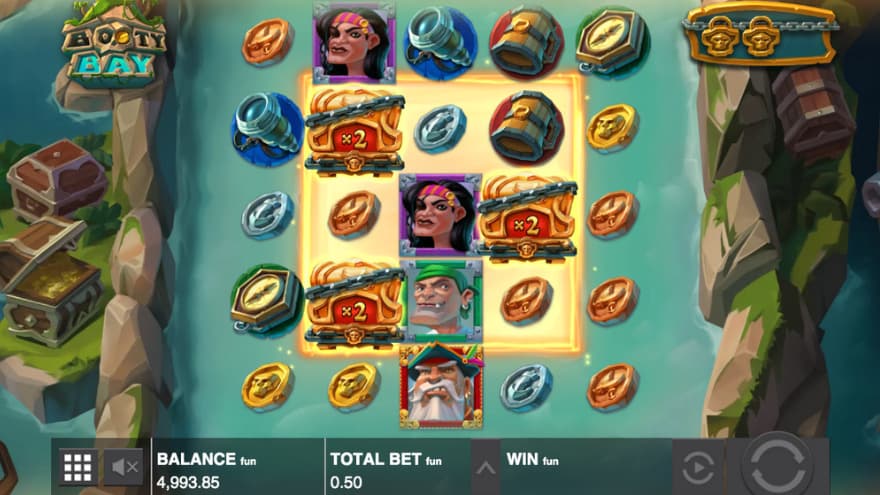 The game's design consists of a pirate theme where we get to accompany a crew to Booty Bay, where large treasures are expected to be hidden. The background of the reels consists mostly of water, where small islands are located, where one of them is the Hotzone. You can also see 3 treasure chests, 1 of which is opened and turns out to be filled with gold coins. If you are looking for mobile slots online, then the Booty Bay slot is a perfect choice as it is created to fit the various mobile, notepad and desktop devices. You create a winning combination by landing 6 or more of the same symbol type in a cluster.