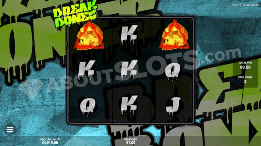The game's design consists of a skeleton theme, where we visit a place surrounded by skeleton bones and skulls. In the background of the reels, you can see graffiti paintings on a wall showing the game's logo and, on the reels, you can land symbols with brightly shining colors. You can play this slot on all the devices notepads, desktops and mobiles. You create a winning combination by landing 3 of the same symbol type on adjacent reels starting at the far left.