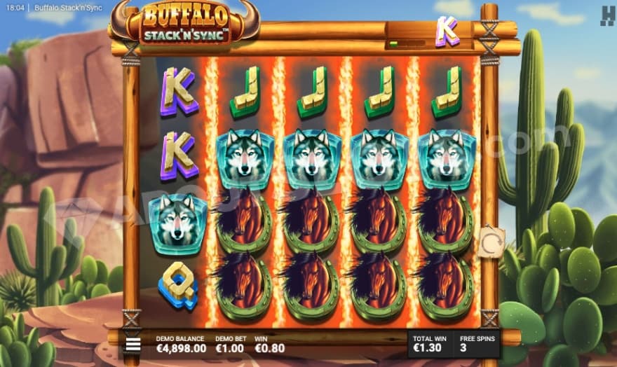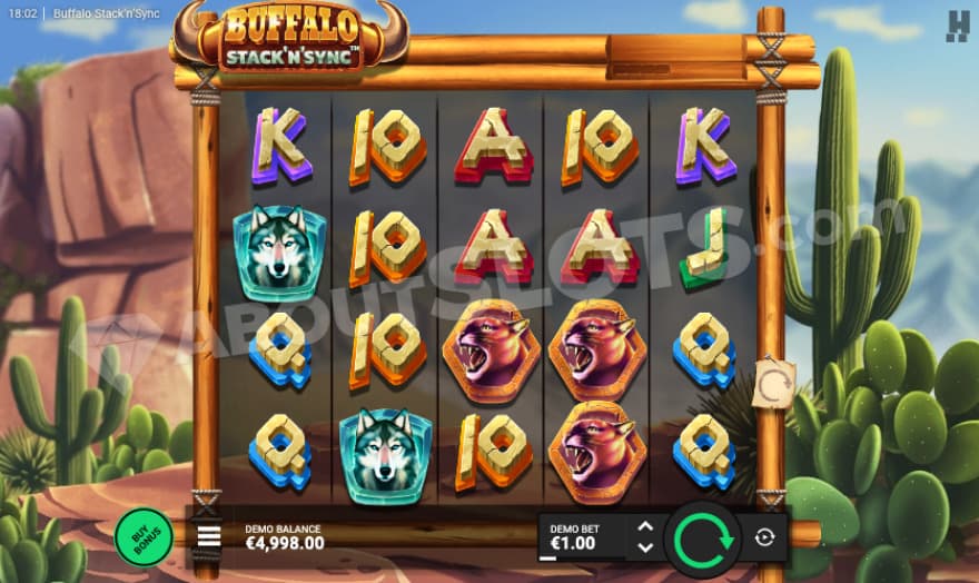 The lower paying symbols are 10, J, Q, K and A. Landing 5 of the same symbol type pays between 2X to 4X the bet. The higher paying symbols are the horse, puma, wolf, eagle and buffalo. Landing 5 of the same symbol type pays 10X to 20X the bet. The game's wild symbol is a cactus, while the scatter symbol is burning buffalo hooves. During the spins you can also land the special Stack 'n' Sync symbol which has wonderful properties. Let's find out what the features do.