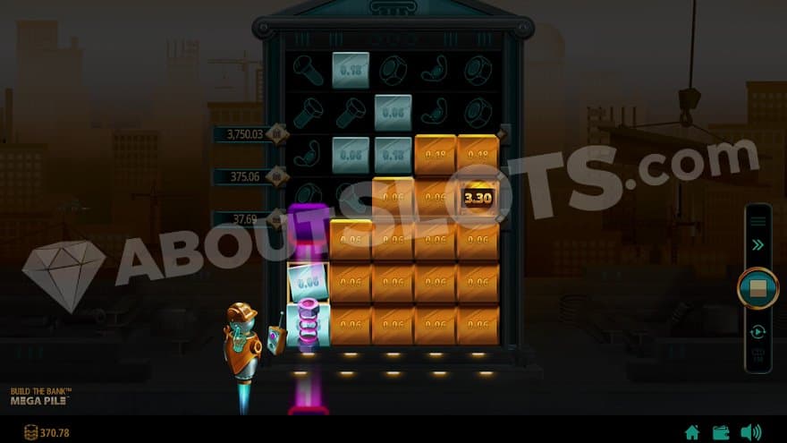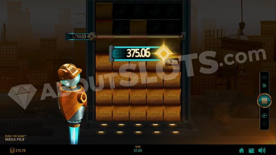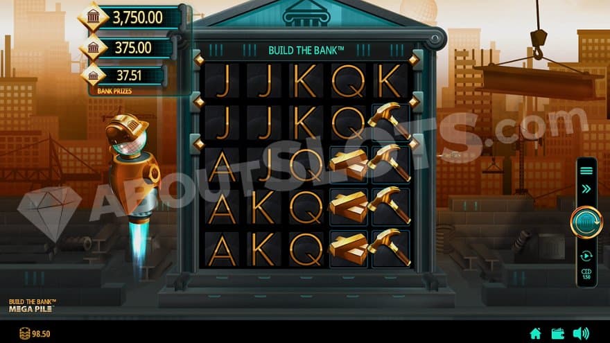 Build the Bank is located at a construction site in a modern city. There are a bunch of tall buildings in the background, and flying spaceship-looking vehicles are flying through the air in all directions. There’s also a big billboard with jet motors, slowly traveling through the city. The bank we’re building is a square metal construction with 5 reels and 5 rows. To the left of it is an orange robot with a construction helmet soaring in the air. It points at the screen and gets involved when wins are being made or when the Mega Pile feature is triggered.