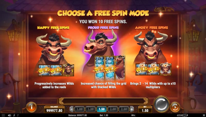 The Bull is also the game's scatter symbol and it comes as a Golden Bull. By landing this symbol on the reel 1, 3 and 5, you activate the game's free spins feature and you will then be welcomed with 10 free spins. During this feature you can successfully retrigger 10 extra spins by landing the same number of scatter symbols as before. But before these spins can be used, you will have to choose between 3 different modes. These different modes are the following.