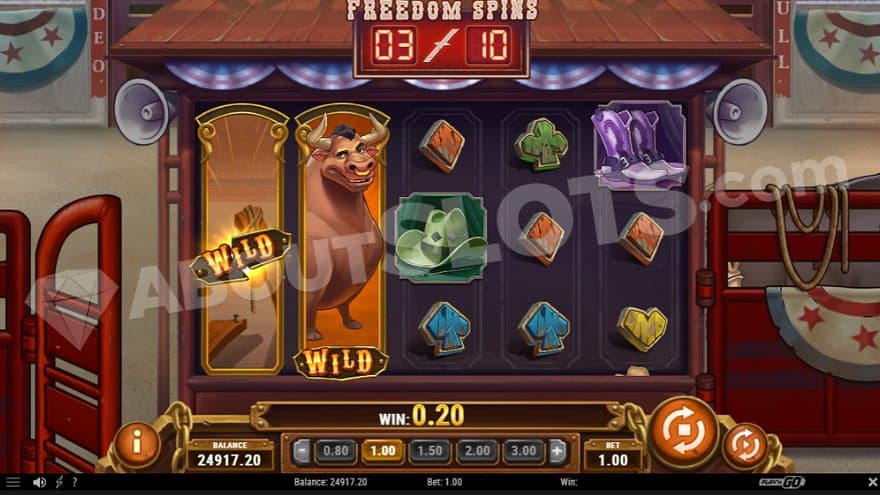 The lower-paying symbols are clubs, diamonds, hearts, and spades. They will award 1X to 1.4X the bet for a 5-symbol win. The higher-paying ones are cowboy hat, cowboy boots, whiskey bottle, mirror, and a rodeo man. These symbols will give the player between 4X and 18X the bet for a 5-symbol win. Benny the Bull is the Wild Symbol, and he gets company by 3 other wild bulls in the free spins. The Scatter Symbol is a gate that will trigger the free spins if it lands with Benny.