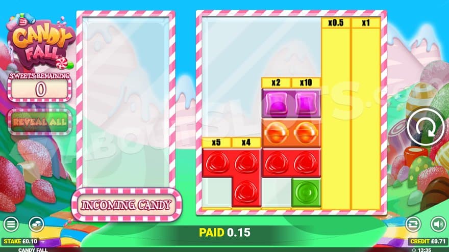 Any reel with no piece of candy symbol after your 12 symbols have been played will reveal a cash prize. A multiplier value on top of the reel awards the prize, which differs on each spin.