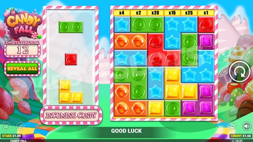 Candy Fall is a new casino slot from Blueprint Gaming. It’s different from regular slots since the aim isn’t to make winning combinations. Instead, you’re presented with a grid full of geometrical symbols reminiscent of the classic computer game Tetris, released in the mid-80s. While hitting the spin button, you’re presented with a total of 12 symbols, 3 at a time. Each symbol is presented in the grid, where it will disappear, and the remaining symbols will fall downwards. To make a win, you need to clear at least one of the six reels from all symbols.