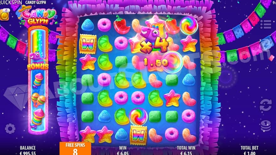Candy Glyph is a new casino slot from Quickspin with the Glyph mechanic players have gotten to know through games such as Warp Wreckers Power Glyph and Golden Glyph 3. This time, sweet pieces of candy spawn a Power Wild whenever you make a cluster win on the 7 reels. Scoring a win with a Power Wild will give you one of four power-ups that make sure to keep you entertained. Bonbon Bombs removes all high and low win symbols in its row and reel, while the Lollipop Rocket removes a randomly chosen low symbol. The Bouncy Bean Power-Up throws out an amazing amount of up to 10 Wilds on the reels. Triggering 5 Power-Ups in a row will trigger the Free Spins, where a multiplier Wild accompanies you during the entire feature. Let's investigate this Candyland even more.