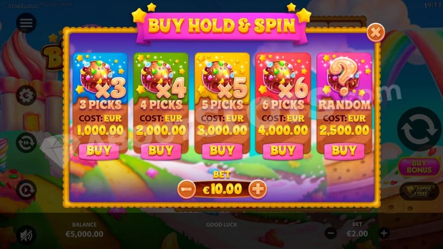 Within this sugar-filled gaming adventure, we have a couple of great features to help us in our pursuit of the huge wins. The features are Cascade, Prize Awards, Hold and Spin, Super Stake, Multiplier Symbols and Bonus Buy.