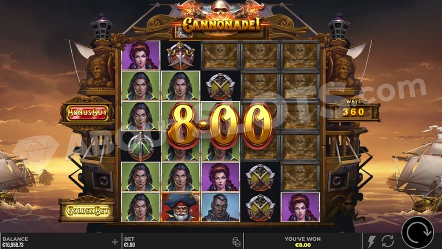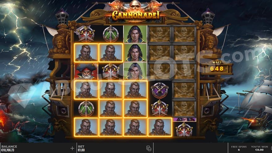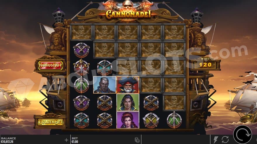 Pirate themes are one of the most popular in slot games, and we have seen both good and bad ones over the years. Earlier this year, we were happily surprised when Fantasma Games took us on an innovative journey in the flying pirate ship of Cloud Corsairs. Cannonade! has more the look of a classic pirate story like Pirate Pays Megaways, where the reels are also placed on the back of a ship. Cannonade! is not as cute and cartoonish-looking, though, but has a more realistic look. We also love the dark moving clouds and the sunlight that seeps through. The developers have surely worked hard on the graphics, and the heavy music helps create a good gaming experience.