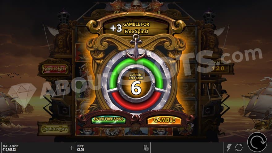 The Scatter Symbol is a pirate ship with its white sails set. Landing 3, 4, or 5 scatters awards 6, 9, or 12 free spins. Any scatter in the free spins will award an extra spin and remove the lowest paid symbol. Up to 6 symbols can be eliminated, but the scatters will still award spins even after that.