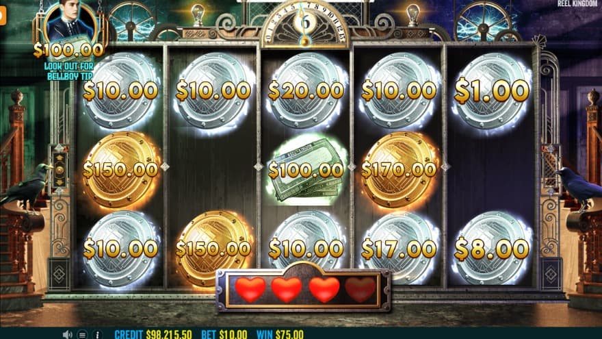 The lower paying symbols consist of beautifully decorated 9, 10, J, Q, K and A. The medium paying symbols consist of suitcases, car, key and telephone. The higher paying symbols consist of a pocket watch, a black cat posing at a full moon and the house where the cash elevator is located. The game's Wild symbols consist of a bellboy and the female inventor, where these symbols are 1X3 in size. You will also be able to land arrow symbols and money symbols during the spins which can result in festive wins. Let's find out what the features do.