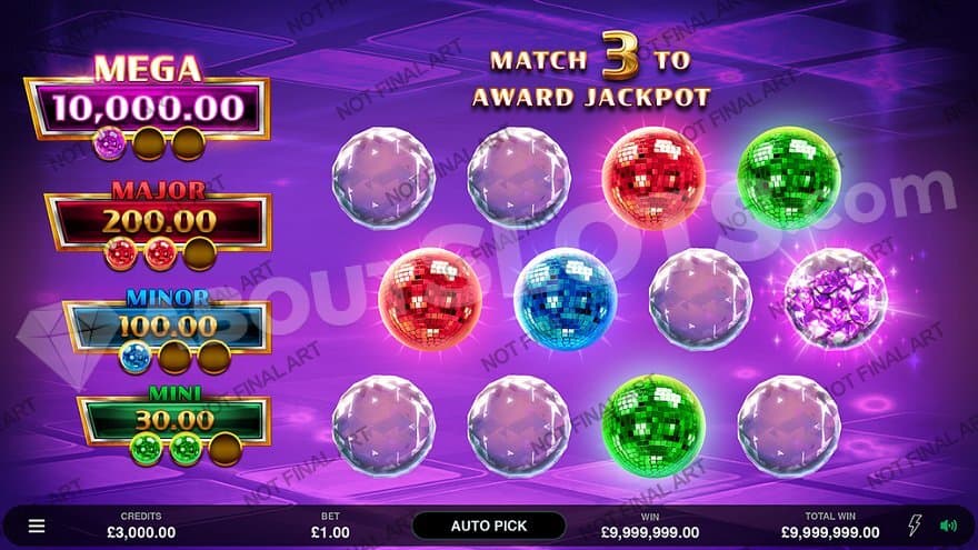 Every time the wild cash symbol hits the extra reel, it is collected in the big disco ball to the left of the reels after participating in any wins. When the disco ball is full of cash, the Jackpot Pick Game can launch randomly on any spin both in the main game and in the free spins. The more wilds you collect, the higher is the chance to activate this feature. The Jackpot Pick Game starts with 12 tokens shown facedown, and you get to pick one token at a time until you have collected 3 of the same color. The color represents the jackpots as follows:
