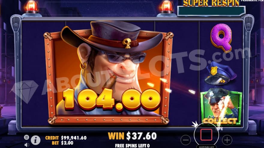 The lower paying symbols are doughnuts shaped like J, Q, K and A. Landing 5 of the same symbol type pays 4X the bet. The higher paying symbols are the handcuffs, police hat, banknote bundles and a car. If you land 5 of the same symbol type, it pays between 5X to 32X the bet. The game's wild symbol is a golden police badge, while the red siren is the game's scatter symbol. During the spins it will also be possible to land money and various collect symbols which are cops and gang members. Let's find out what the features do.