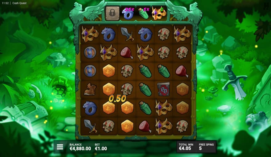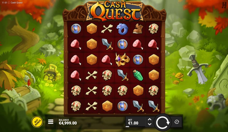 The game design is based on a fantasy theme, where we go on a quest for big wins in an enchanted forest. In the background of the reels, you can see a green nature, where the leaves fall slowly and overgrown swords, skulls and chests are half visible. You can play this slot on all the device’s mobiles, notepads and desktops. You create a winning combination by landing 5 or more of the same symbol types in a cluster on adjacent positions.