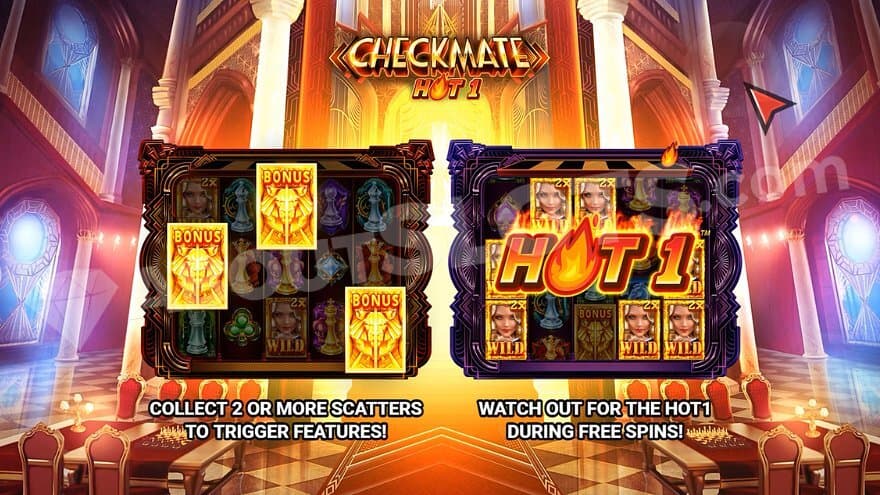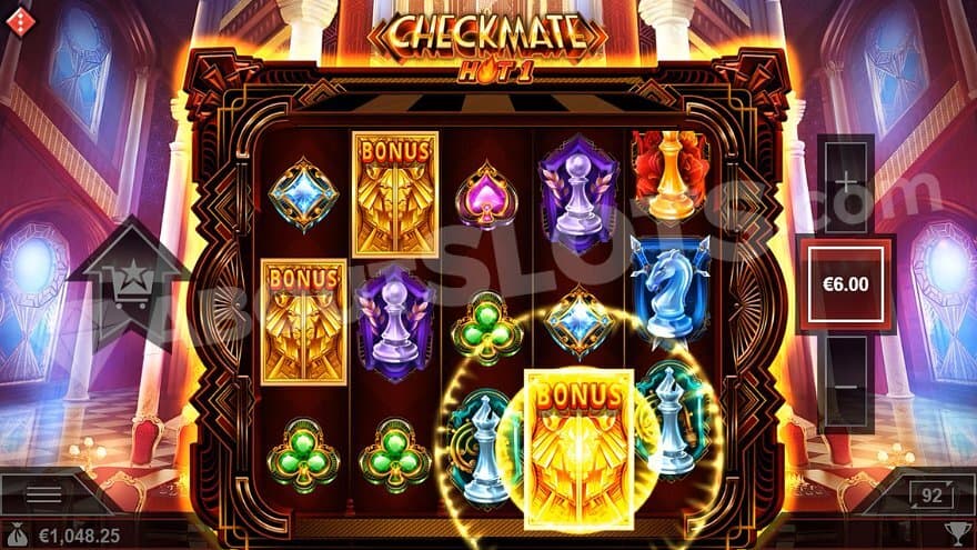 The Bonus Buy in Checkmate Hot 1 lets you buy the free spins feature for 75X the bet. The Bonus Buy guarantees to give you a spin with between 3 and 5 scatter symbols.