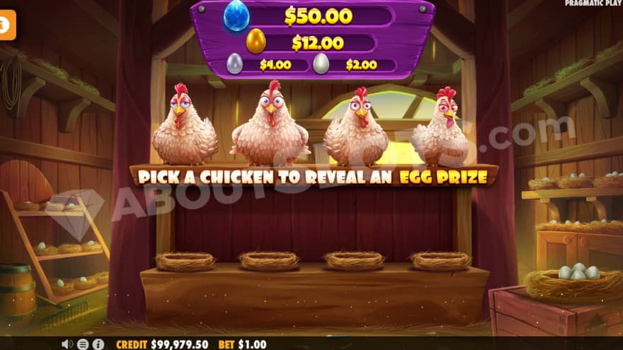 If you land 3 or more scatter symbols, the Bonus feature will be activated. Within this feature, you will get to choose between 4 different hens that have different prizes awarded to them. Depending on the number of scatter symbols you had at activation will result in different sized prizes being available, whereby the selected hen will lay an egg which will then hatch with your instant win.
