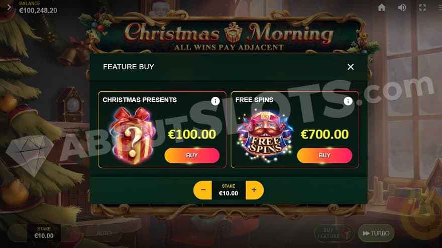 On this amazing Christmas morning, don’t miss the features Mystery Symbol Christmas Present, Free Spins, and Bonus Buy.