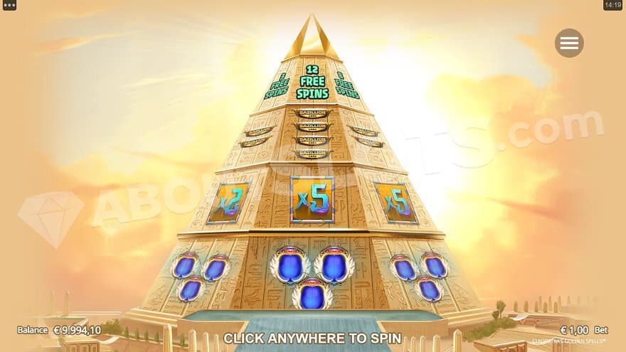 The Scatter Symbol is a pyramid saying “free spins,” and you need to land at least 3 scatters anywhere on the reels to activate the free spins feature. Every scatter symbol that lands in the free spins awards an extra spin.