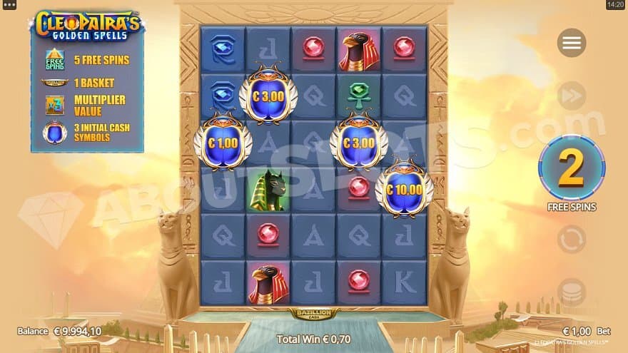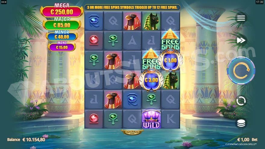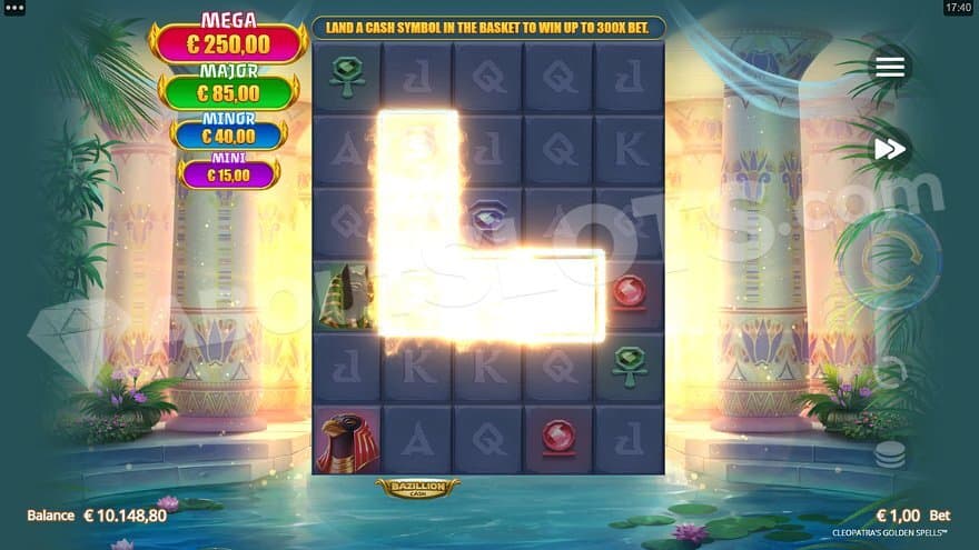 In this ancient Egyptian adventure await some really useful tools. Make sure to get familiar with the features Cascading Wins, Wild Symbol, Scatter Symbol, Cash Symbol, Bazillion Cash Basket, Bazillion Cash Feature, Cleopatra’s Golden Spells, Jackpot, Pyramid of Fortune, and Free Spins.