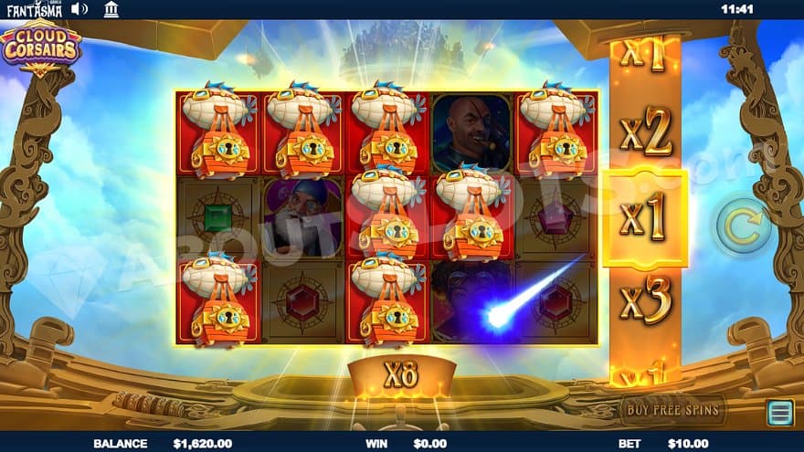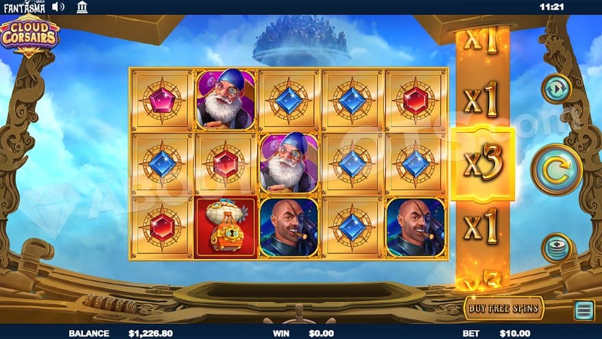 Cloud Corsairs is a video slot from Fantasma Games with 5 reels, 3 rows, and somewhat odd 27 paylines. There’s also an extra reel containing multipliers from 1X to 10X. The Min.bet is 0.25 and the Max.bet is 30. The default RTP is 95.67%, but there’s also a version with a lower RTP of 94.48%. The max win among the clouds is 7690X the bet, and the volatility is medium/high. The hit frequency is 21.78%, and the free spins activate 1 time in 342 spins on average. While in the free spins, the average win is 95.6X the bet.