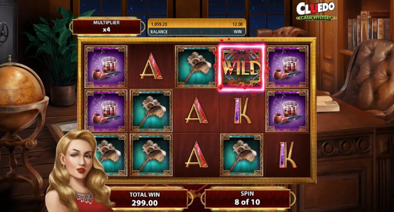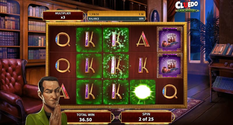 One of the symbols Q, K, A, feather duster, pipe with a whiskey glass or magnifying glass with the Cluedo text on it will be selected. When you then spin and win, the standard win lines will payout first and then the selected symbol will expand across all the reels on which they are located. This can certainly create a large variety of winning combinations and the great thing is that they do not have to start on the reel at the far left first to make a win.