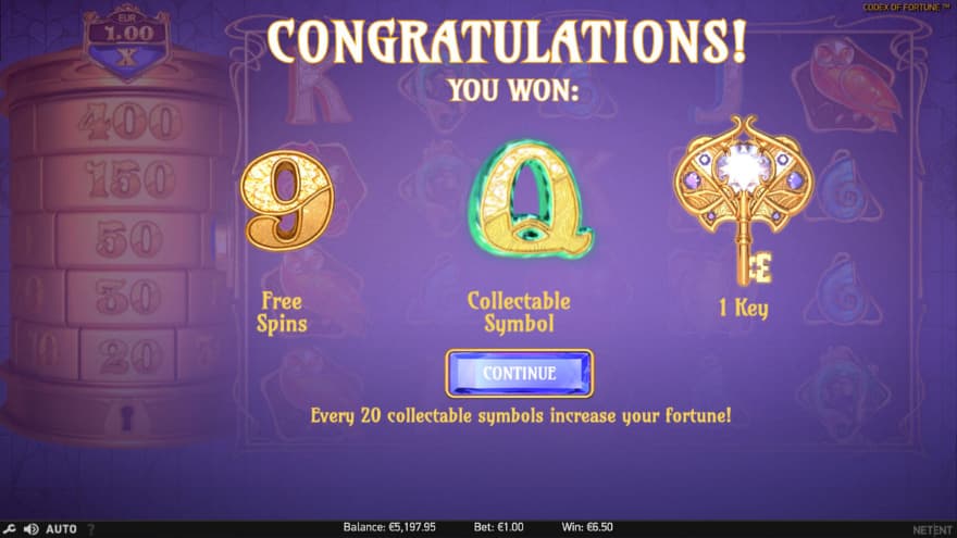 This feature is activated through both the Fortune Re-Spins and the Free Spin feature. You will to the left of the reels see a gold-colored cylinder that will show different values depending on how many key symbols and unique collectable symbols you have collected. Something that applies in both features is that this cylinder has 7 levels, where each level has 5 steps. By gradually increasing the level, a higher multiplier will be obtained, where within the Fortune Re-Spins you can get up to 200X and within the Free Spins you can get up to 10000X.
