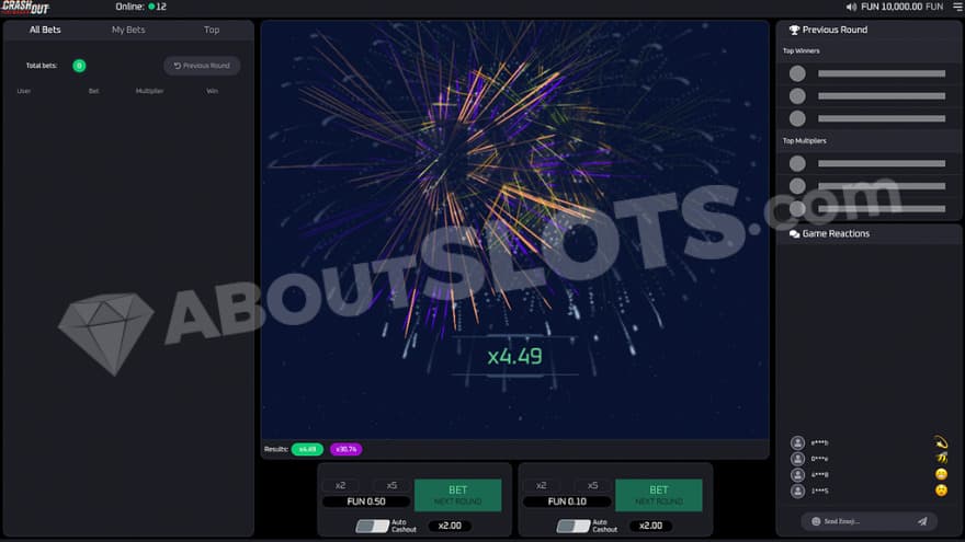 At first glance, the display might feel a bit cluttery. However, there’s not a whole lot of essential information or mechanics you need to know about. On the right side of the game, you can send emojis and react with other players. Above that, you can see the previous rounds' top winners and top multipliers. On the left side, you can keep track of all bets being placed on the current round and see when players are cashing out.