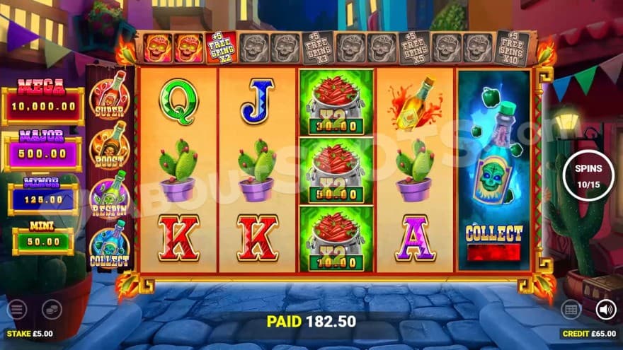 3 Chilli Collect Symbols = Awards 5 additional Free Spins + 2X Multiplier for all collected Cash Symbols