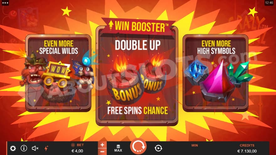These are some bonkers dwarves, and they provide several mechanics to keep you entertained. The features are Wild Symbol, Special Wild Symbols, Scatter Symbol, Crazy Mode, Free Spins, Win Booster, and Bonus Buy.