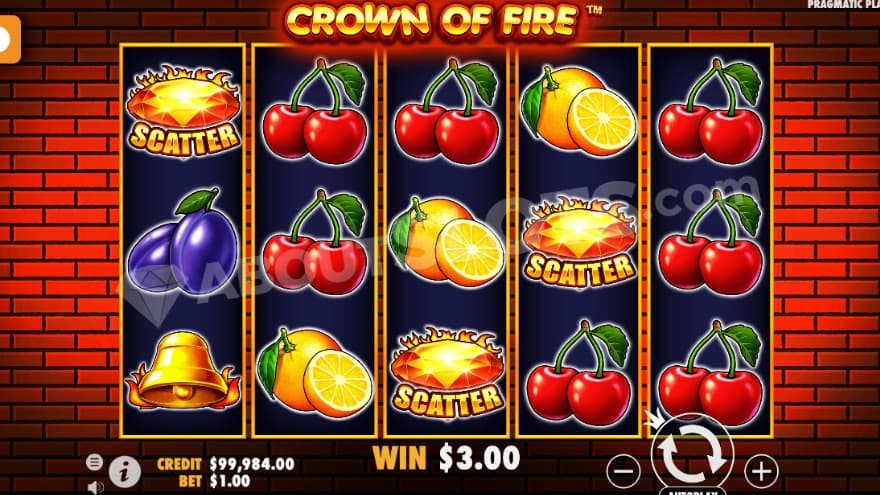 Crown of Fire is a new casino slot from Pragmatic Play that offers a gaming experience steeped in a nostalgic casino feeling. Unlike other slots that this game provider has created, such as Book of Golden Sands, this is a much simpler gameplay that we get to enjoy. It's a game that, apart from the Wild symbols, doesn't have any extra feature, because here it's all about winning combinations, like in the good ol' days. We've seen similar games recently with simple setups like in the game Up4Timer and this game is clearly targeted for the nostalgic souls out there. Let's find out what you can expect to see during the spins.