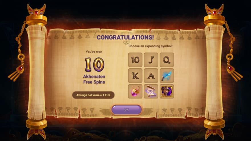 When the Akhenaten symbols land, they are collected and when you have collected 14 of them, the Akhenaten Free Spins feature is activated. You will then be welcomed with 10 free spins, and you can retrigger the feature by landing 3 or more scatter symbols at the same time. You will then be able to choose a regular symbol to become the special expanding symbol. During the spins, this special expanding symbol will expand and cover its entire respective reels when it has the right number of symbols required to create a win. They do not have to be on adjacent reels to create a win, it is only required that the right amount of symbols land.