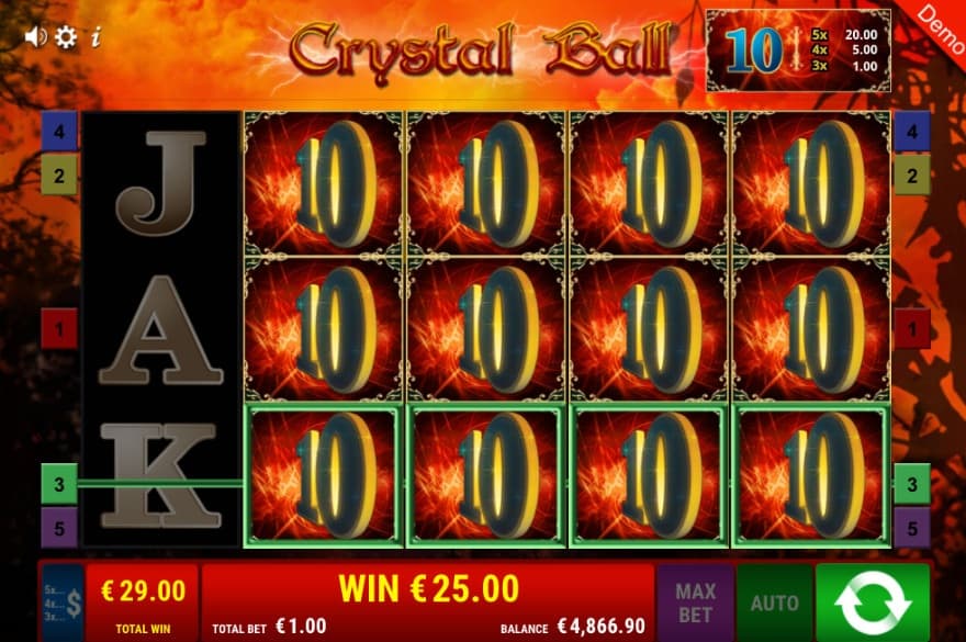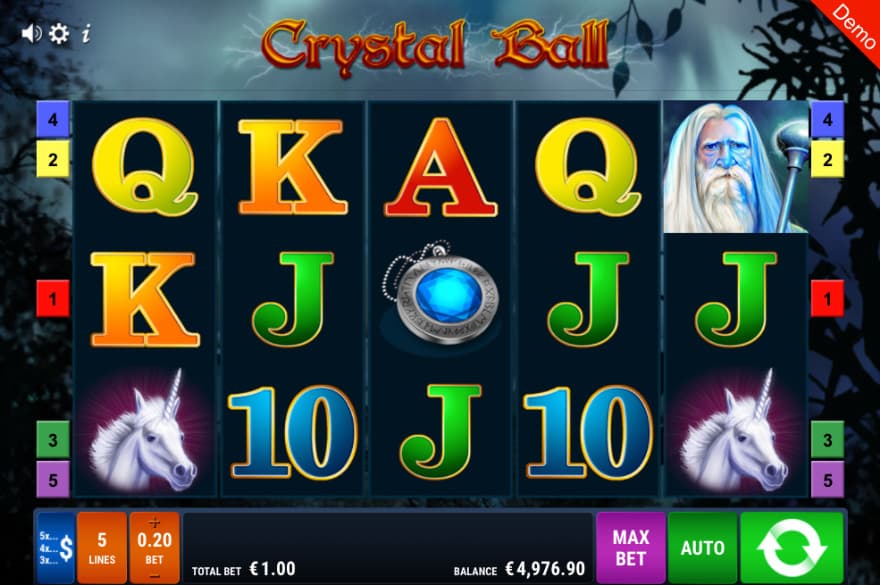 Crystal Ball is a video slot from Gamomat that has 5 reels, 3 rows and 5 paylines. One can choose between making a Min.bet of 0.05 and a Max.bet of 100. The RTP is around the average, where in this slot we have an RTP of 96.12%. There is a high volatility which can result in it taking several spins before wins are generated, but once you hit a win it is usually of the larger kind. The lucky player can win 5000X/spin during the spins.