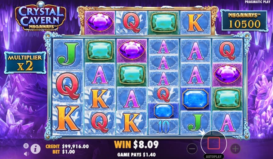 Crystal Cavern Megaways is a video slot by Pragmatic Play that feature 6 reels and 2 to 8 rows. This variation in the number of rows is due to the Megaways mechanic, which can result in up to 200704 ways to win. You can choose between making a Min.bet of 0.20 and a Max.bet of 100. This is an above average RTP, where the RTP is 96.46% by default, but this RTP can vary with different gaming operators, and you should therefore check what applies before you spin the reels. There is a high volatility, where the lucky player can win up to 10000X the bet.