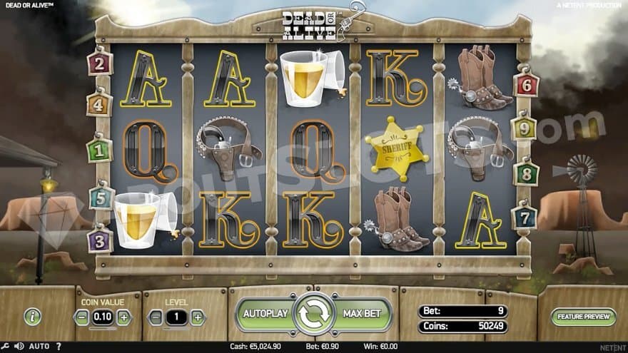 Dead or Alive is a really good-looking slot, although the graphics aren’t anything extra, at least not so many years after its release. The reels are placed in the middle with the gun smoking logo on top. To the left is a gas light dangling in the wind, and to the right stands a windmill tower looking just like you picture the Wild West. On the side of the reels hang nine signs with the numbers 1-9, representing the game’s paylines. All buttons to play the game are at the bottom of the screen. You make a win by landing at least 3 of the same symbol on any of the 9 paylines going left to right. All wins must start at the first reel, with the exception of the Scatter Symbol which makes a winning combination as long as at least 2 symbols land anywhere on the grid. Since the bet is put on each of the 9 paylines, you can’t place a bet of 1, the closest is 0.9. The game is available on mobile phones, notepads, and desktop computers.