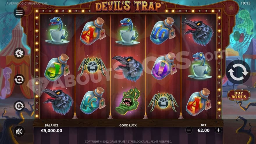 Devil's Trap is a video slot from Stakelogic that features 5 reels, 3 rows and 20 paylines. You can choose between making a Min.bet of 0.20 and a Max.bet of 100. The game has been created with 4 different RTPs, with an RTP of 96.26% by default, but game operators can also choose from the lower RTPs of either 93.78%, 90.00% or 88.02%. Devil's Trap has a medium/high volatility when the highest RTP is used, while the volatility drops slightly to medium when any of the lower RTP options are used. During the spins you can win up to 10000X the bet within the base and bonus game.