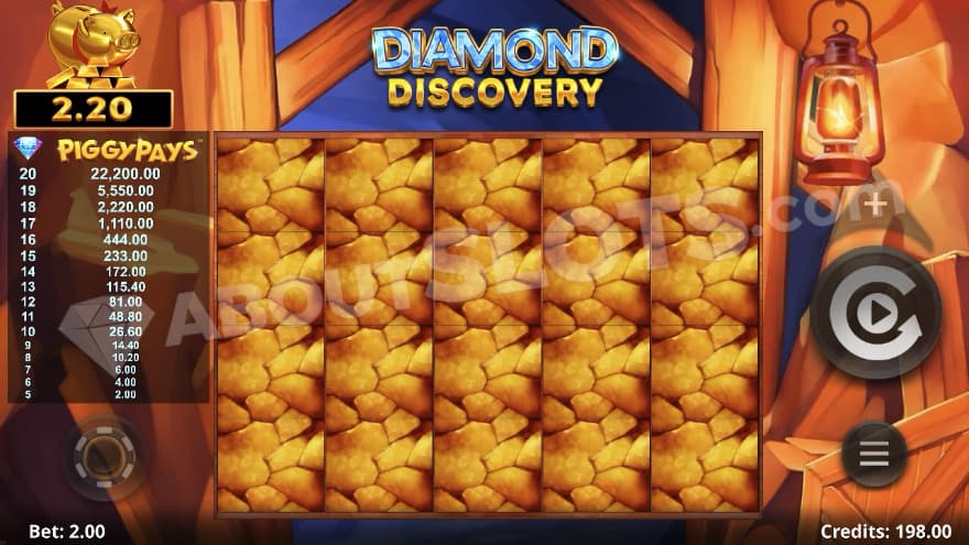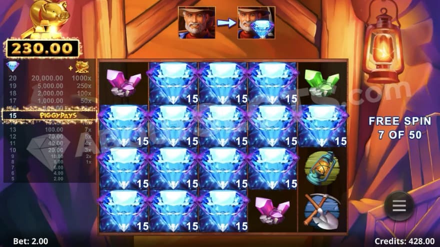 Landing 1-4 Diamond symbols boost the Piggypays meter. On the diamond paytable, you’ll see multipliers attached, starting from 8+ diamonds. The value collected in the Piggypays meter will be multiplied when you land 8 or more Diamond symbols. If you land 10 diamonds, it will be multiplied by the value shown at the 10-diamond payout, and so on.
